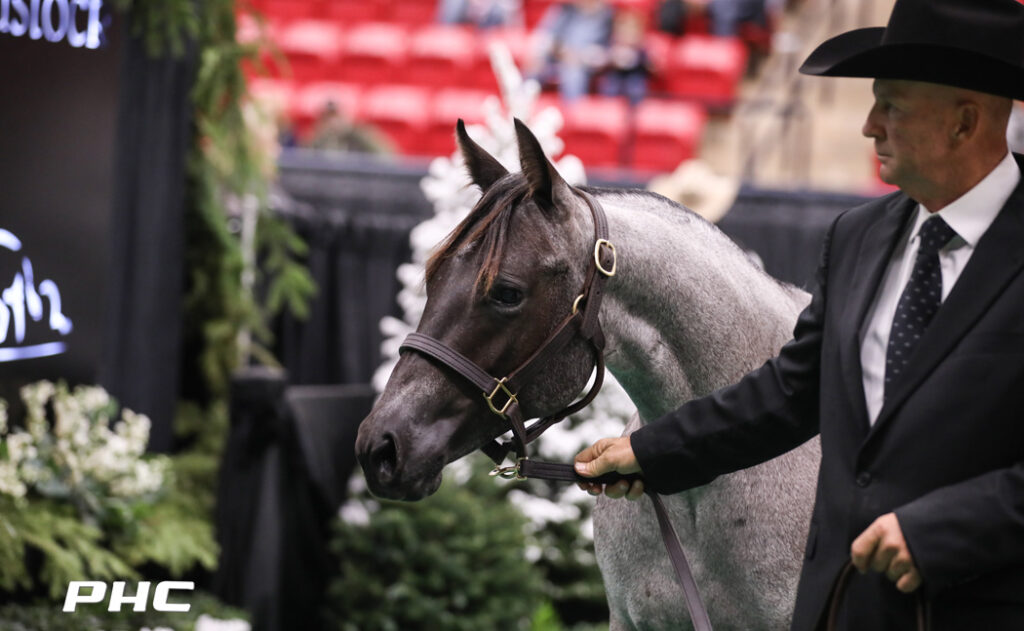 Missy Von, a yearling blue roan filly sired by Stevie Rey Von, brought $405,000, the Preferred Breeders Sale Session IV’s highest price. Bred and consigned by Slate River Ranch, Missy Von is a full sister to 2022 NCHA Futurity Open finalist and Open Gelding Champion Wombatt LTE $127,912, among 13 money earners of $1,055,321 million out of Play Miss LTE $180,165, including NCHA multiple major event Non-Pro Champion Flash About LTE $246,087.